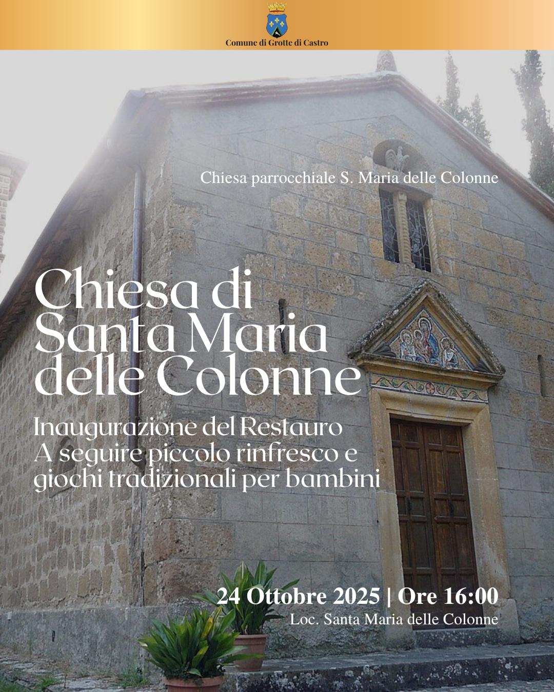 Il giorno 24 ottobre 2025, alle ore 16,00, avrà luogo l'inaugurazione del restauro della Chiesa di Santa Maria delle Colonne al termine dei lavori che l'hanno interessata.